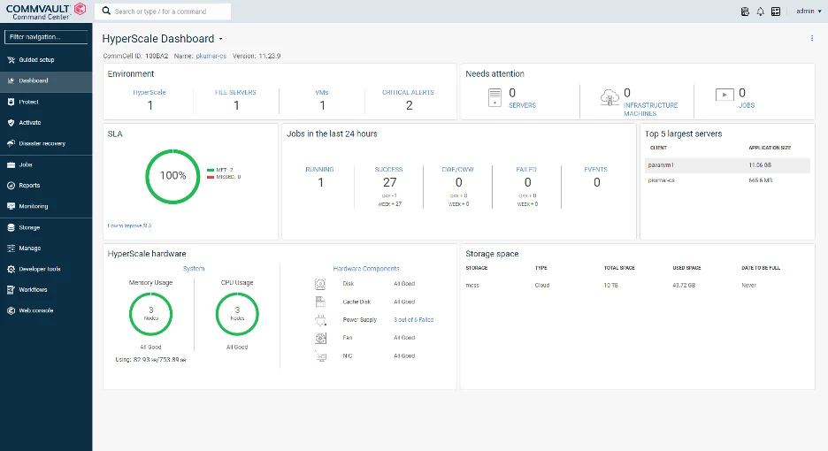 When it comes to Reference Architectures, while each hardware vendor that HyperScale X supports might offer an independent method to monitor hardware health, monitoring through Command Center offers a unified experience, think “one console to rule them all” – whether it is the data protection software or data protection infrastructure that you are monitoring. With our latest release we have extended the hardware monitoring support to all supported Reference Architectures. You can monitor the hardware health through the HyperScale X dashboard, as well as get notifications through built-in alerts. As Commvault alerts are already integrated with third party monitoring and ticketing systems with webhook extensibility, you can also integrate these alerts into such systems and get custom notifications.