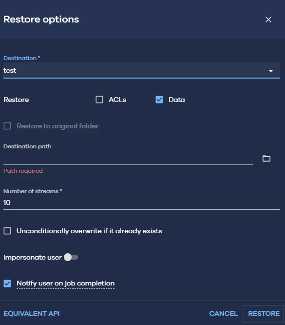 When using web command center for the restore, those options are not available. the only thing we can chose is the destination server, path, ACLs and unconditional overwrite.