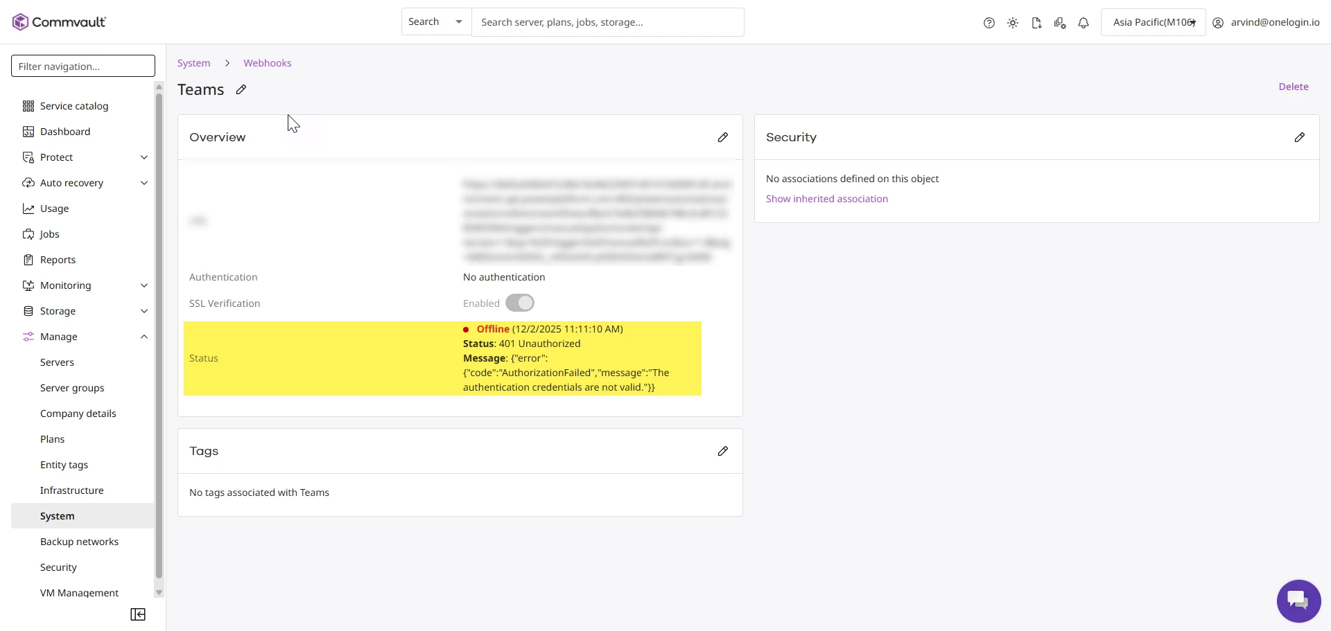 Via MS TEAMS >Workflows>Manage I’ve created a workflow called Send Webhook Alerts to a Channel and copied the URL created. I’ve then go to Commvault Command Center>Manage>systems and created a Webhook and provided a name and used the copied URL. I’ve then sent a test alert from Commvault to the webhook however the status of the Webhook in Commvault remains in red with error he status 401 Unauthorized with the message{"error":{"code":"AuthorizationFailed","message":"The authentication credentials are not valid."}}