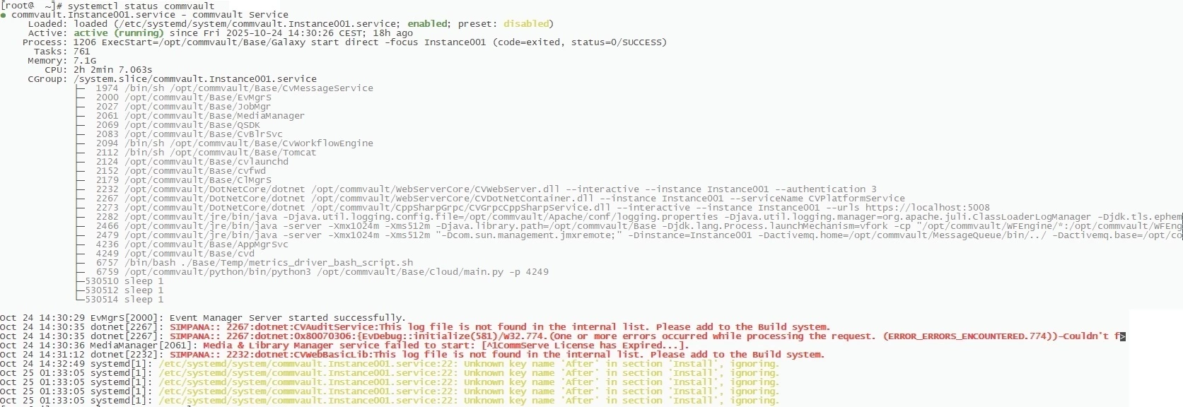 We are doing a POC installing Commcell 11.40.X on Linux. The Linux distribution is RHEL 9.6. After installing Commvault, the installation seems to be successful, but when we run “systemctl status commvault”, we see the following error messages:
