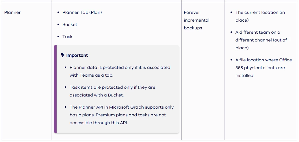 commvault does support backup and restore for MS planner specifically when the planner plans are associated with Microsoft Teams as Planner tabs The backup includes buckets tasks & plan metadata accessible through the Microsoft Graph API.