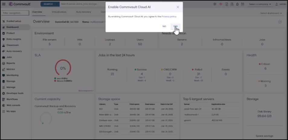 Arlie Opt-in/Opt-out Access: Arlie, our AI assistant, is now easily accessible in the Commvault Cloud platform with opt-in/opt-out access. Opt-in to gain insights and specific action steps to optimize your cyber resilience.