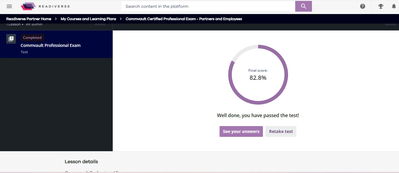 I have completed the Commvault certified professional course with 82%, but I haven’t received the certificate yet. Can someone please help me get the course completion certificate?"