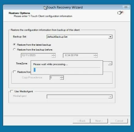 I performed full backup of windows server 2012 which was successful and trying to do 1-touch bare metal restore in other server of same model, it just keeps progressing endlessly as shown in the picture.