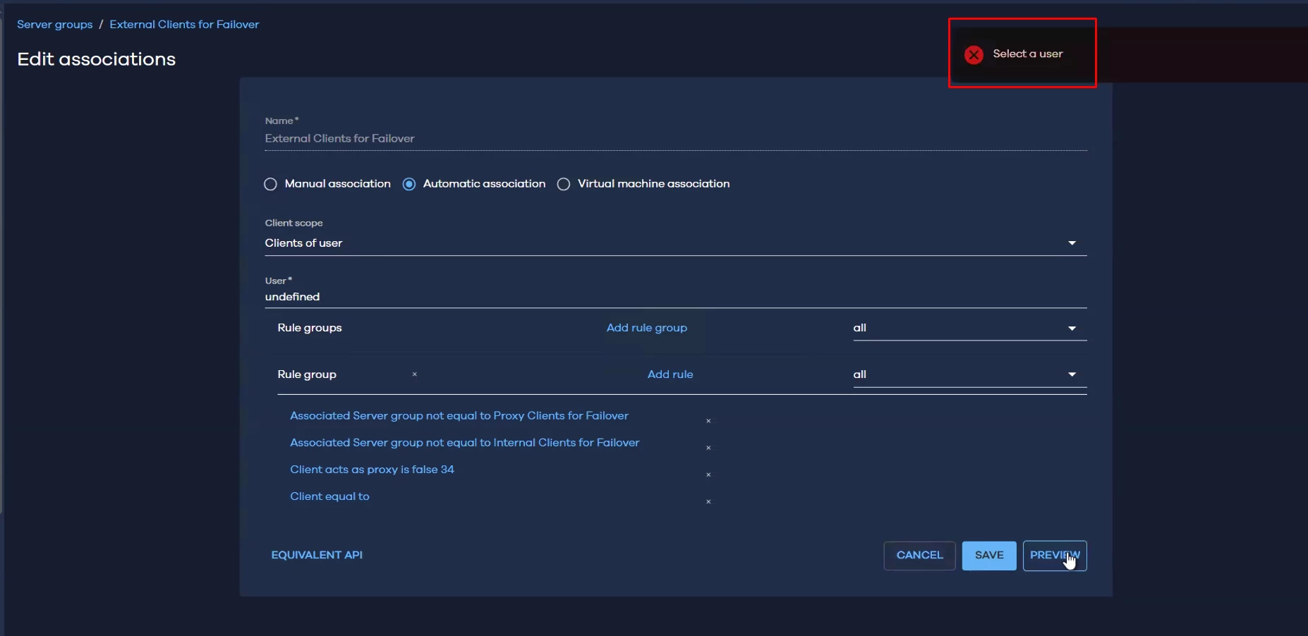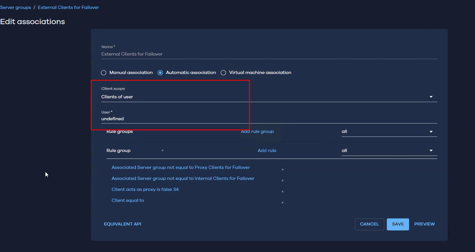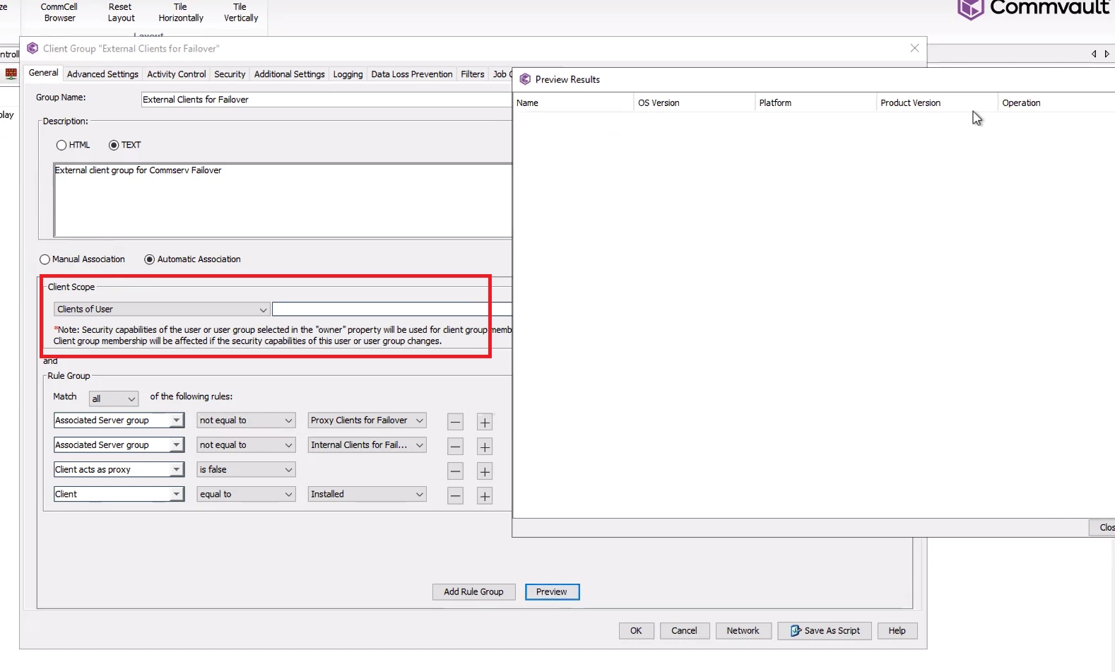 We found a solution to this problem, but it shouldn't work automatically like now. The group creation process for failover configurations doesn't work correctly for versions SP40 and SP42. We confirmed this in two different environments, and the behavior was the same - the association value is incorrectly set to "Client of user" instead of "Clients of this CommCell."
