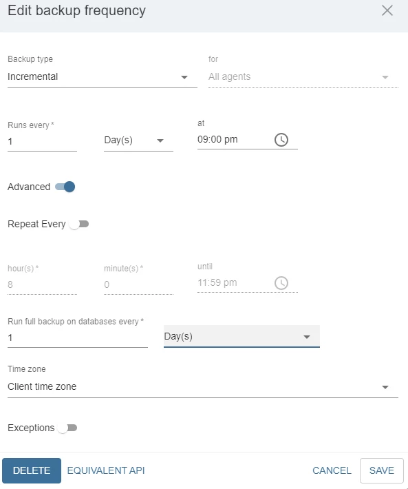 I modified the rule "run incremental every 1 day(s) at 9:00 PM" by clicking on the pen icon and adding a rule. See the screen below. I checked the "Run full backup on databases every" option.
