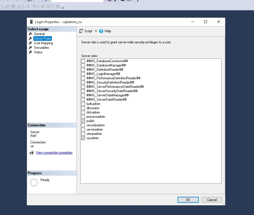 Description: Instance validation failed: Insufficient SQL Server role. To configure the instance, the user [sqladmin_cv] must be a member of the SYSADMIN SQL server role.