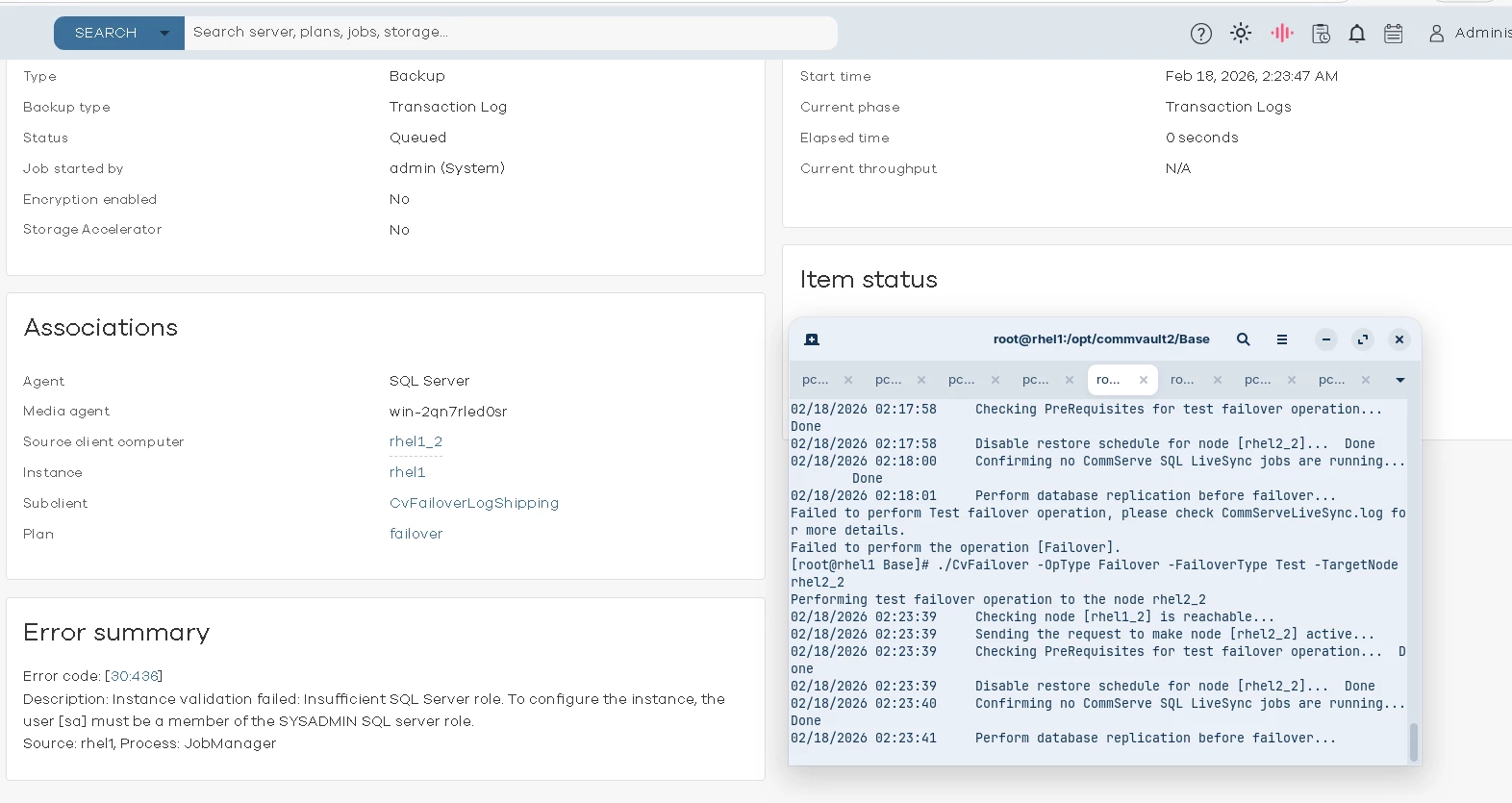 When we attempt to perform the failover, the CvFailoverLogShipping job gets triggered but fails with the following error: