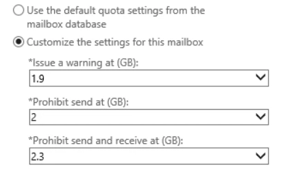 Customer configured quota limit with 2 GB, something like this but he selects (user the default quota settings from mailbox database. not customize