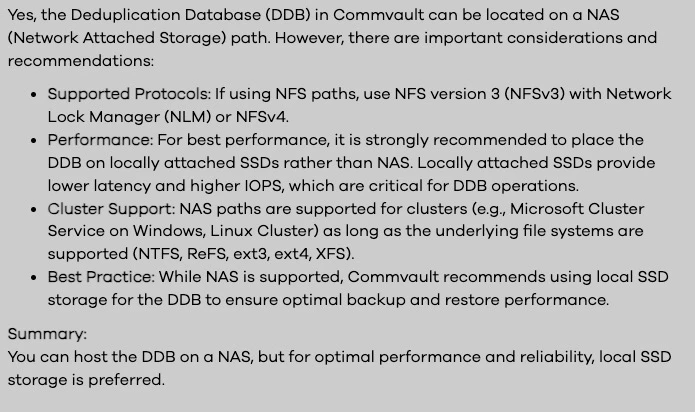 I want to confirm whether the DDB can reside on NAS storage or if it must be located on MediaAgent-local storage.