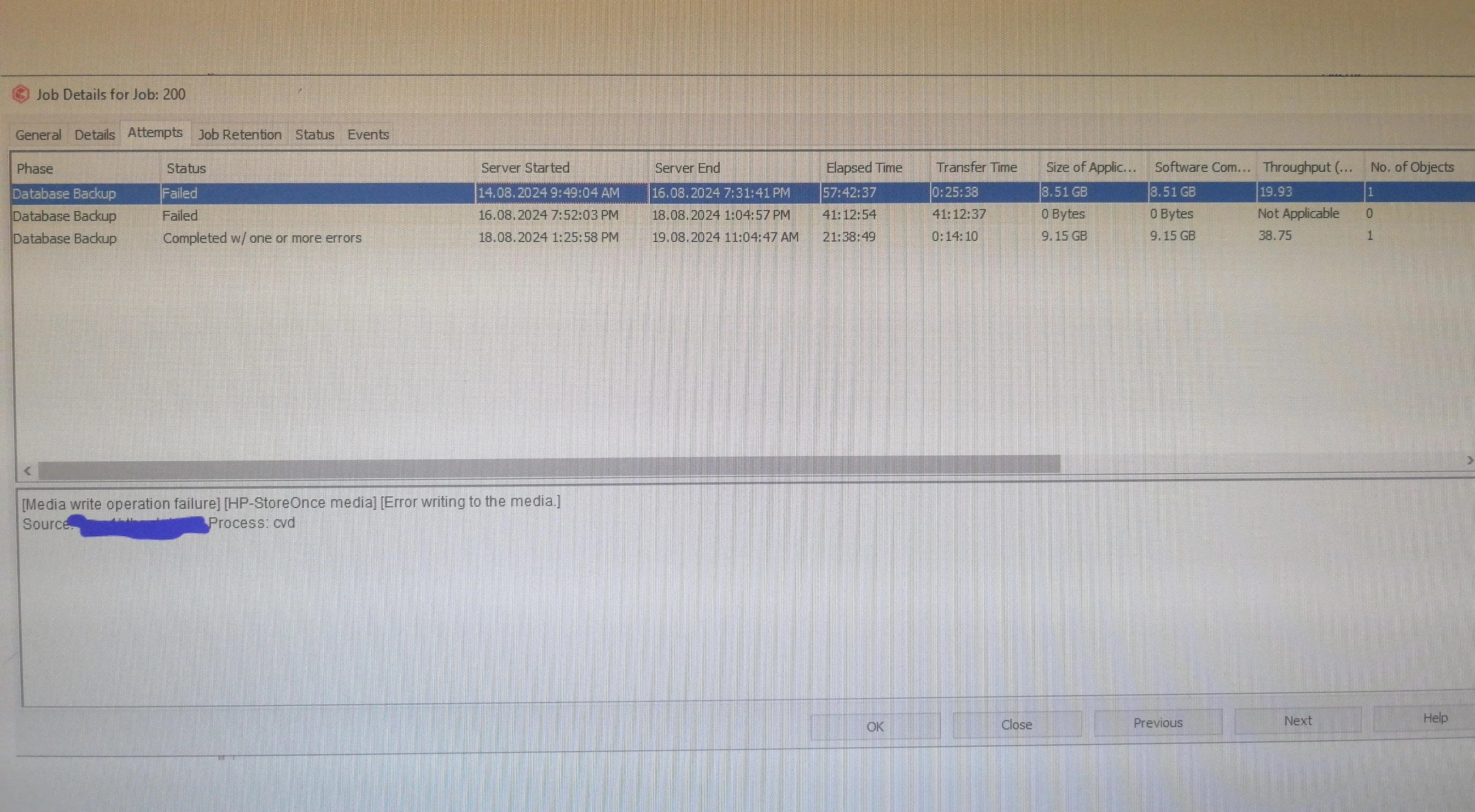 Some time after running the job, the backup job fails to complete due to "Media Write Operation Failure-HP StoreOnce Media-Error writing to media".