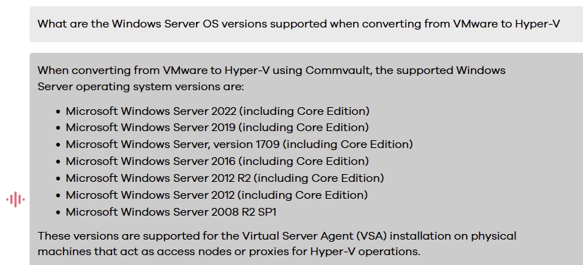 I’m planning to convert virtual machines from VMware to Hyper-V using Commvault’s “VM Conversion” feature. The official documentation https://documentation.commvault.com/11.42/commcell-console/converting_from_vmware_to_hyper_v.html mentions that a Windows Server 2012 R2 host is required as the destination system.